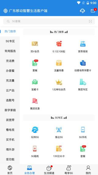 ·业务办理:5g,上网,通话,功能与设置,短/彩信,生活与娱乐,流量特惠包,流量共享,8折叠加包