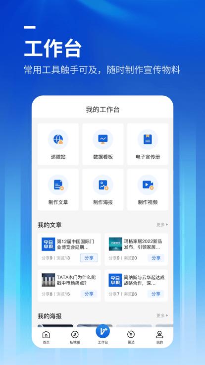 位加门窗圈是以社交方式获客的智能营销工具:分别有文库、海报、制作文章、制作海报、制作宣传册、递名片、数据看板、私域圈、雷达、我的足迹、我的圈子和成员名片等功能模块。